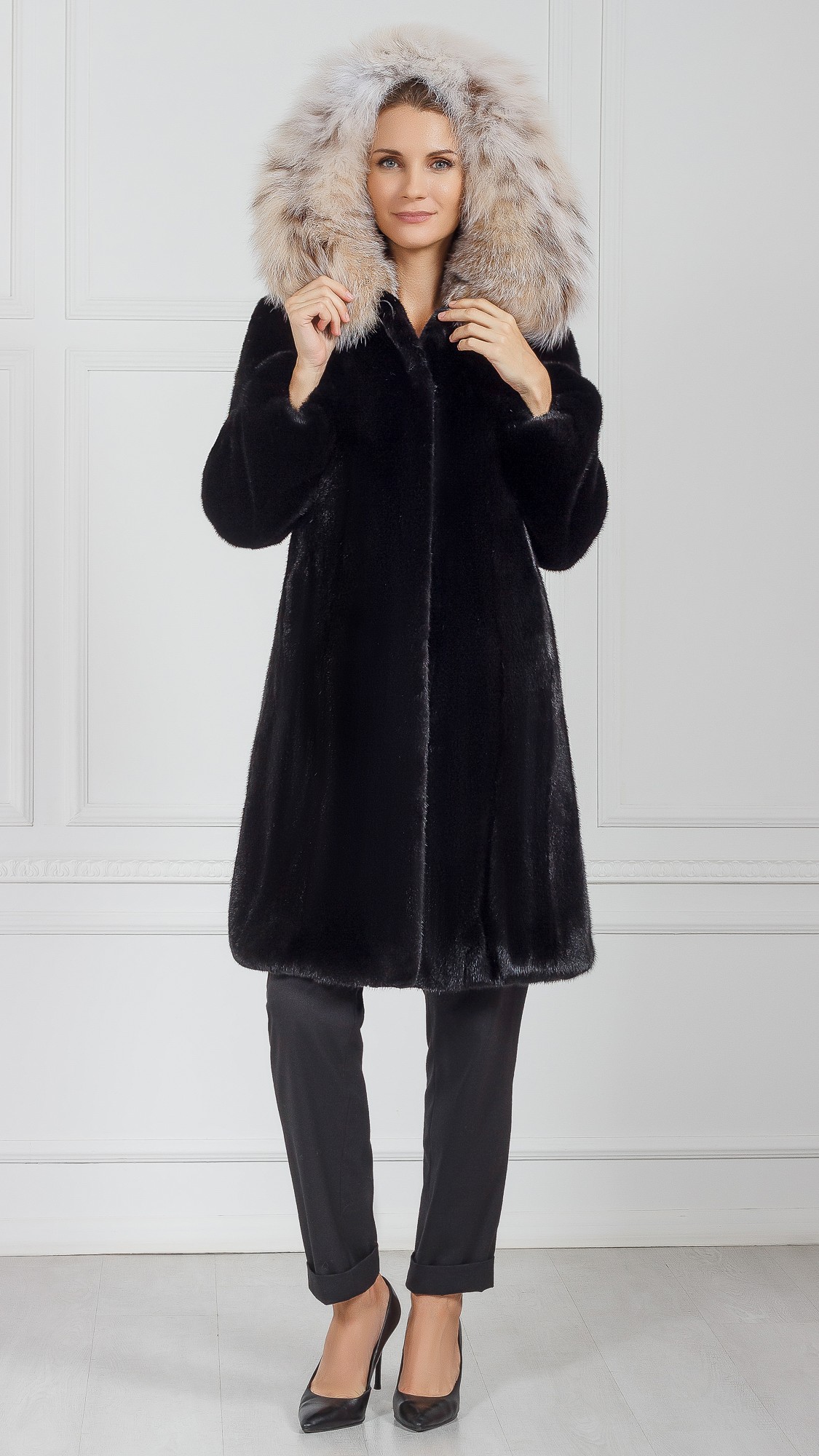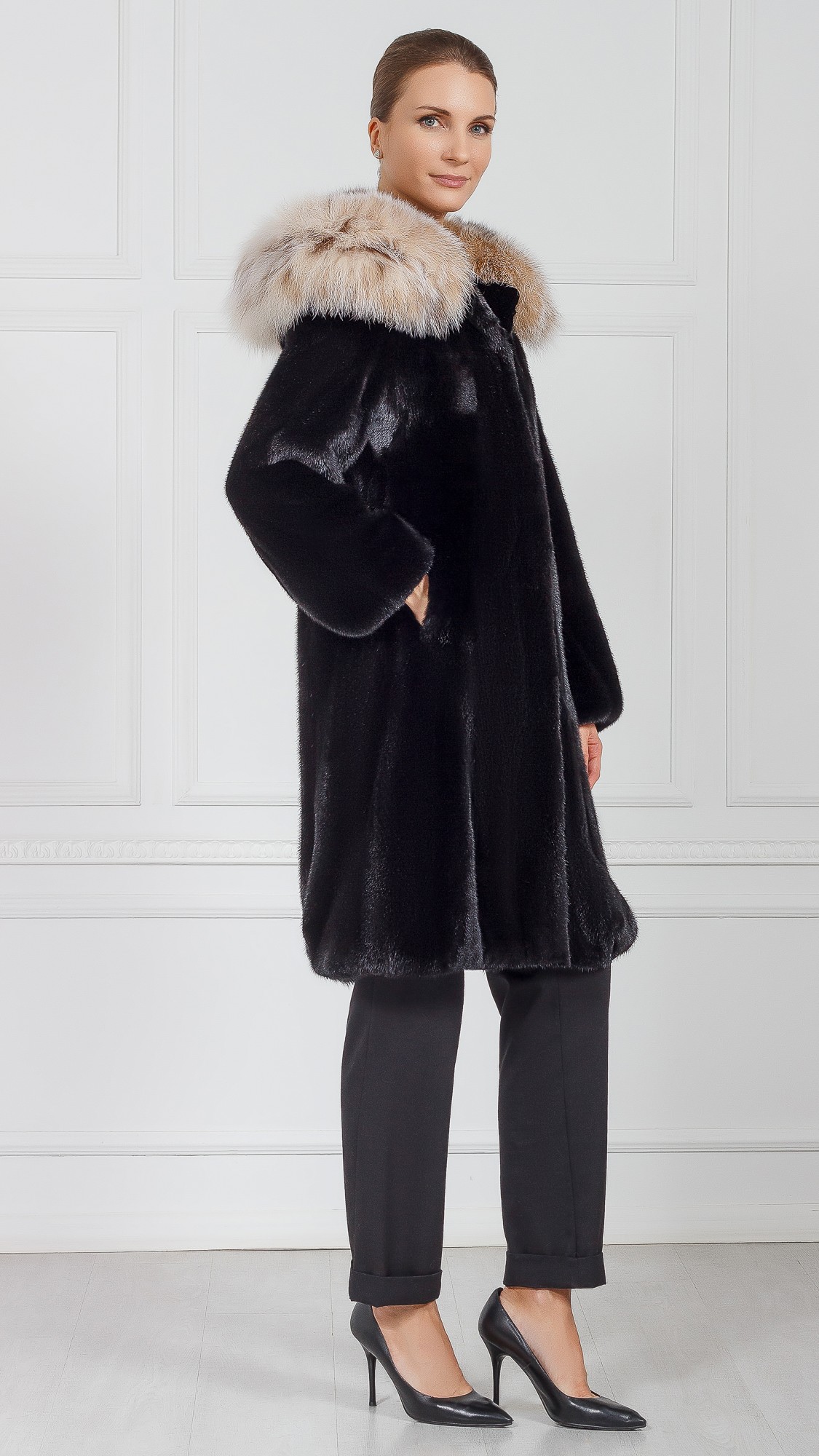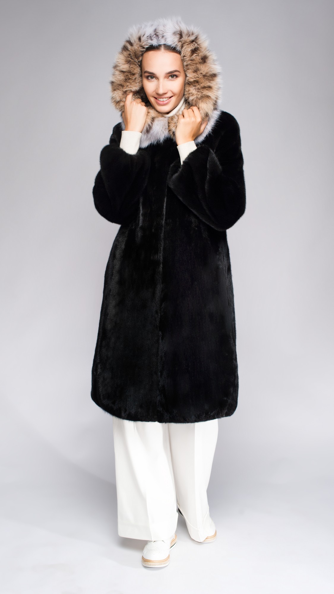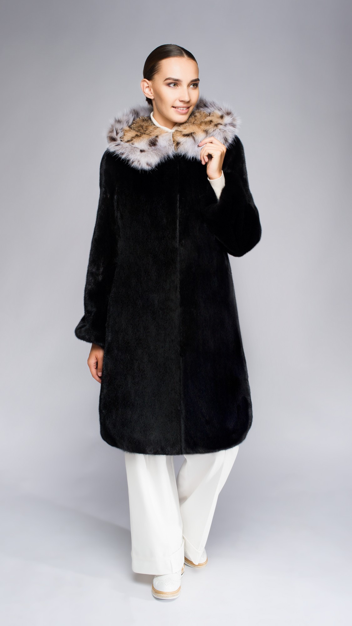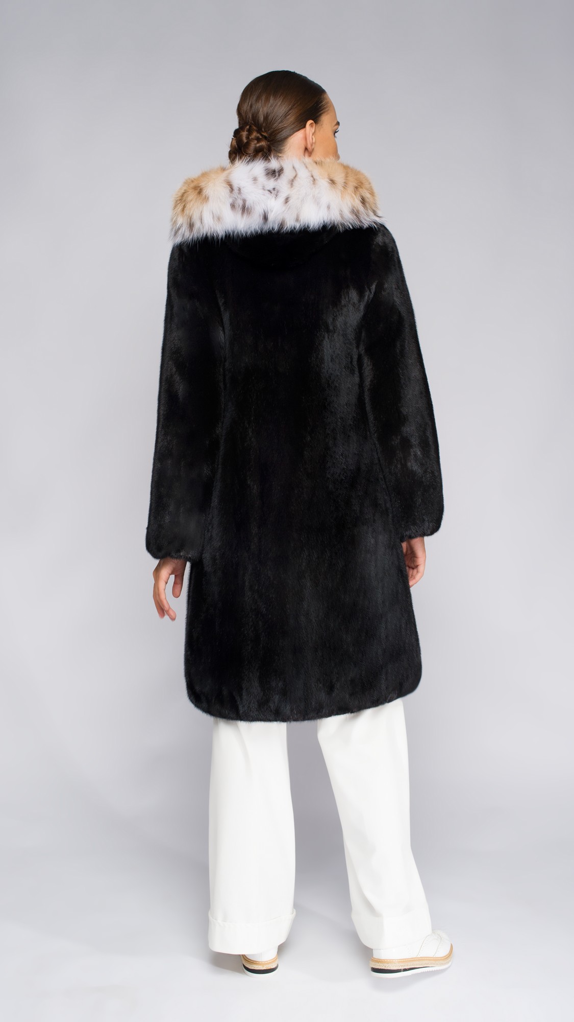 Шуба из меха норки, отделка рысь
